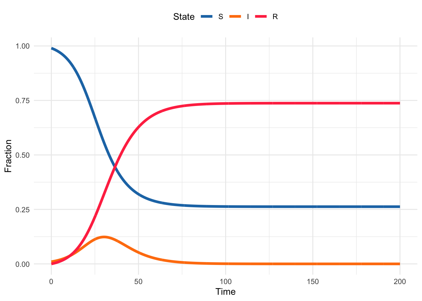 Now we have some intuition behind how the different parameters affect the dynamics of the SIR system, let’s look at how we can implement this in R. Below is some R code that implements the basic closed-population SIR model. The purpose of the questions in this exercise is to guide you through the code and help you understand how it works so you can modify it to answer your own questions.