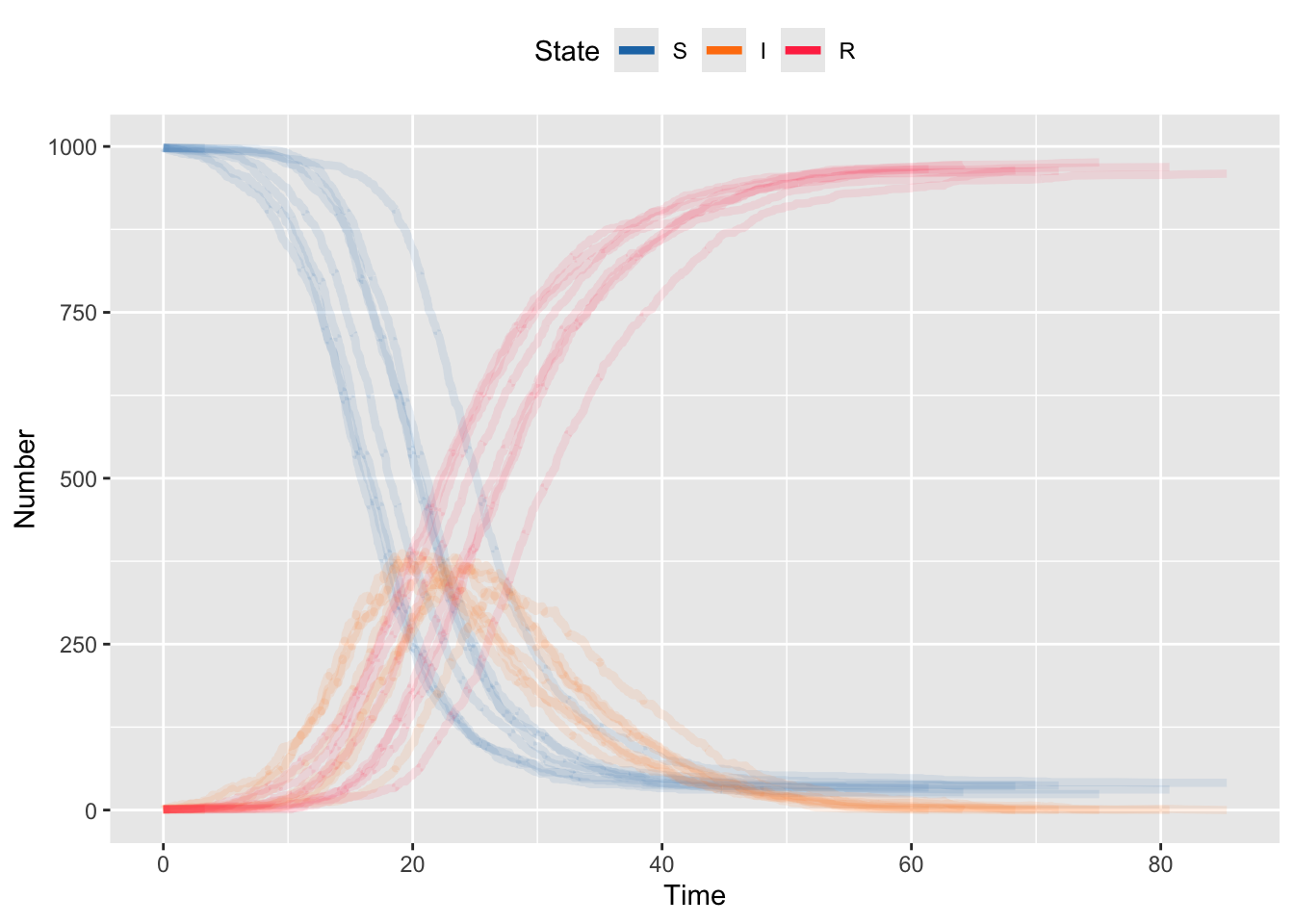 }Note in the code above that we’re taking Poisson random draws, but there is some code commented out that uses binomial draws. The former is exact for the theory, but it can give rise to settings where the transitions “get ahead of themselves” and you have more recoveries than infecteds, or more infections than susceptibles, which drives the states negative. We can fix this by checking if the states go negative and disallowing this … which is inelegant. We can also fix this by using binomial draws, which are naturally constrained not to go negative. The reason we don’t automatically start with binomial draws is that they are computationally slower than Poisson draws (this occurs because the binomial distribution includes some combinatorial terms that are slow to compute). As computers have gotten faster, this is less of an issue.